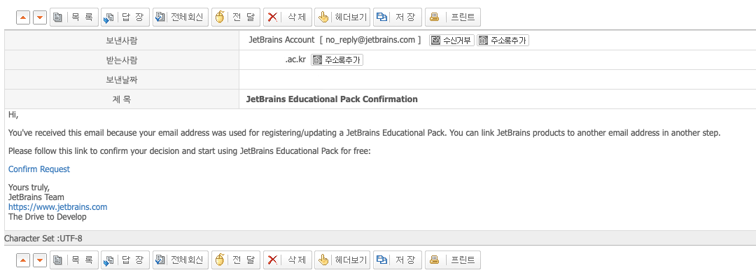 Confirm Request를 클릭해 주시면 JetBrains의 본인 계정에 라이선스가 업데이트 되게 됩니다.