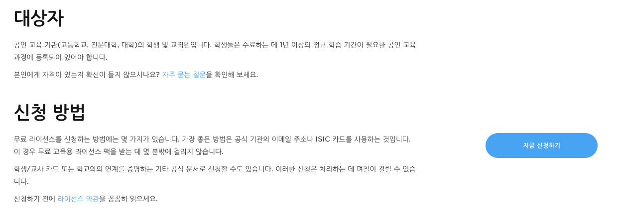 무료 교육용 라이선스를 지원하는 안내를 받을 수 있습니다.